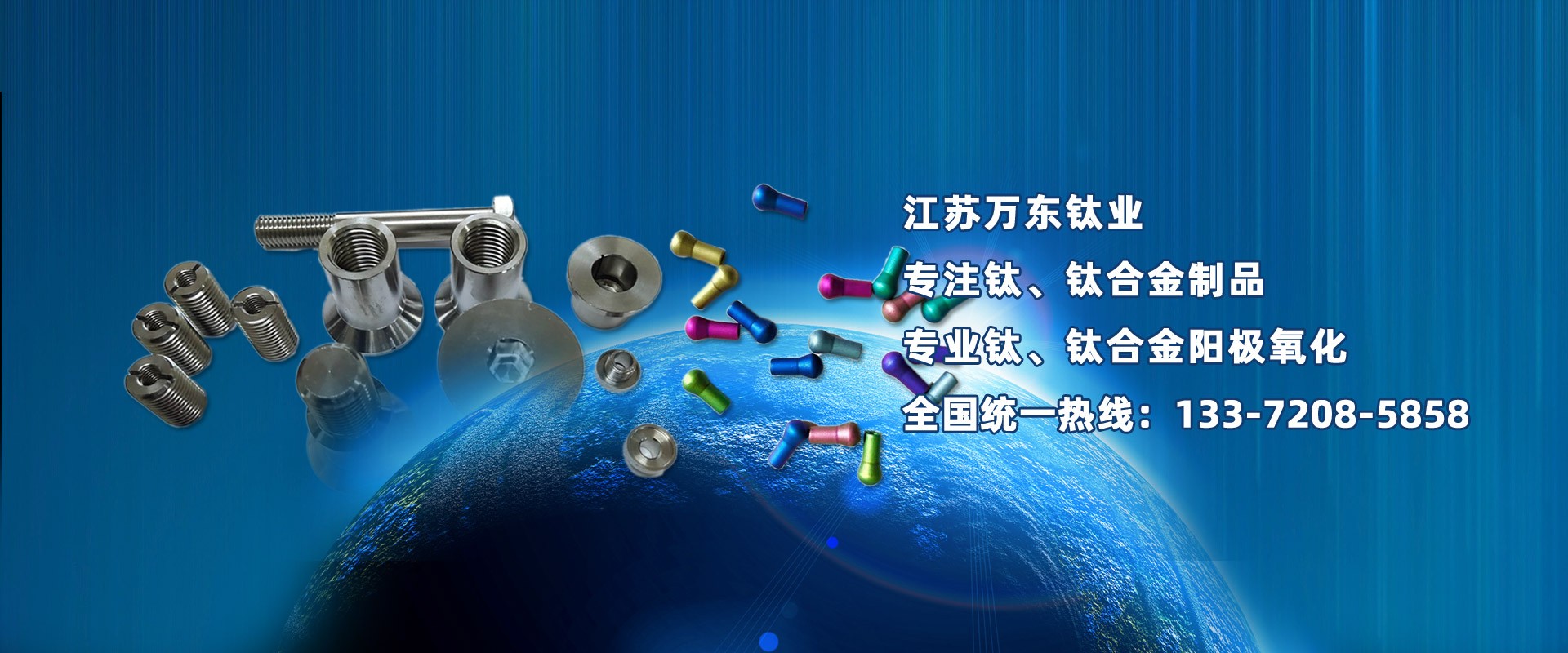 江蘇萬東鈦業(yè)科技有限公司坐落于中國江蘇省南通市,擁有28年的鈦合金研發(fā)技術,公司專業(yè)從事:鈦陽極氧化、鈦合金陽極氧化、脈沖氧化。鈦合金緊固件生產(chǎn):M0.6以上高品質:螺絲、螺母、螺柱、螺套、可根據(jù)用戶的特殊要求定制。
